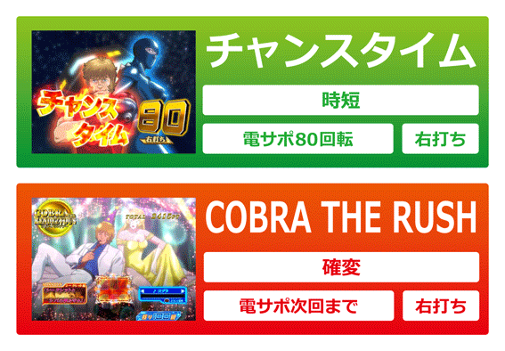 次回大当りまで電サポが続く確変モード。1~79回転は多彩な演出を楽しめる「コブラ・ザ・ランデブー」、80回転以降はコブラVSクリスタル・ボーイの「コブラ・ザ・バトル」が展開する。