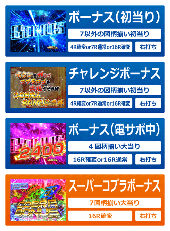 7以外の図柄が揃うとボーナスprチャレンジボーナスが発生。ボーナス中の昇格タイミングは2カ所で、ラウンド中にコブラロゴギミックが作動すれば4R確変、7R終了時のVギミック作動は16R確変に昇格。何も起きなかった場合は通常大当りとなる。