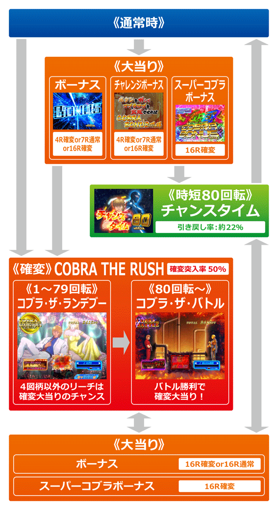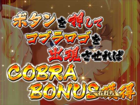通常時の7以外の図柄揃い直後に発生の可能性がある。ボタンPUSHでコブラロゴギミックが作動すれば4R確変に昇格。失敗するとボーナスが発動するが、ラウンド中や終了時に確変へ昇格することもあるぞ。