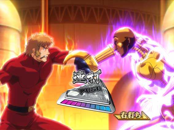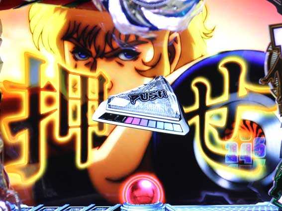 通常時の図柄揃い直後は、ボタンPUSHで7図柄揃いへの昇格を狙う演出が発生する。昇格に失敗しても、直後にコブラロゴギミックが作動して逆転昇格となるパターンも存在するぞ。