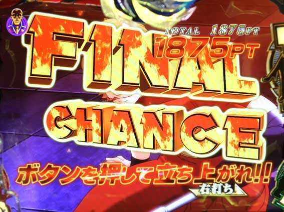 電サポ中の4図柄揃いで発生。ラウンド中はFINAL CHANCE発生時にボタン連打でコブラが立ち上がれば16R確変に昇格。演出に失敗すると16R通常大当り濃厚で、終了後は80回転の時短に突入する。