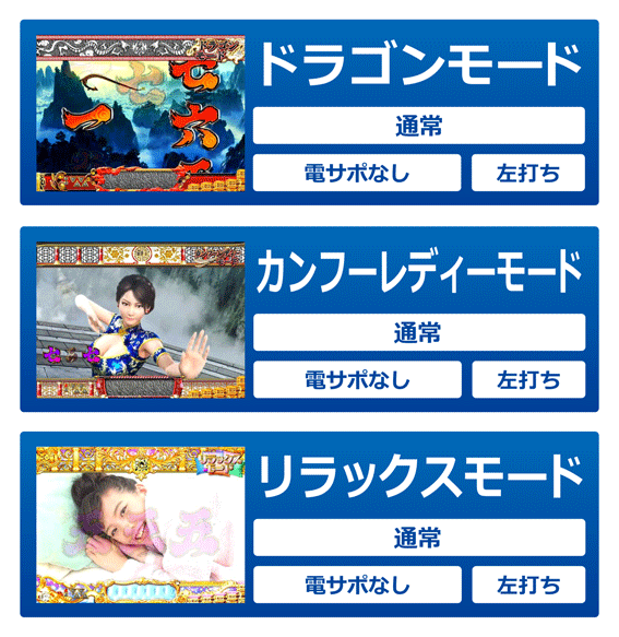 カンフーレディーモード中の大当り終了後に突入する通常モードで、20回転継続。女優・宮原華音の日常をテーマにした、『ドラゴン伝説』の世界観とはちょっと違った演出を楽しめる。なお、確変等の可能性はないので即ヤメしてもOKだ。