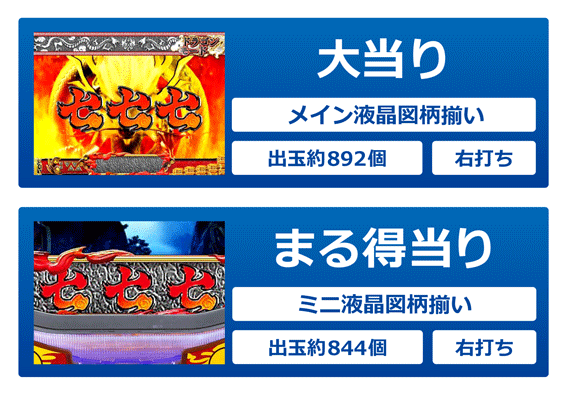 通常時の図柄揃いor中央「当」図柄停止で発生し、獲得出玉は約892個(払い出し)。大当り中に液晶下部のミニ図柄が揃うと次回大当りゲットとなり、当該大当り終了後に次回大当りが発動する。