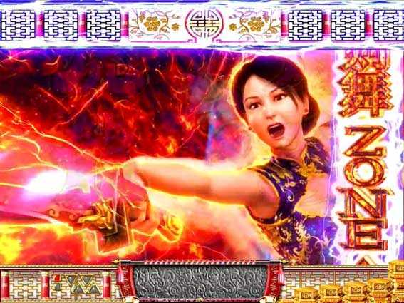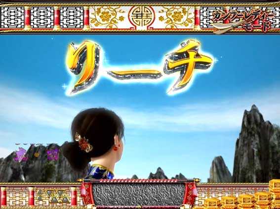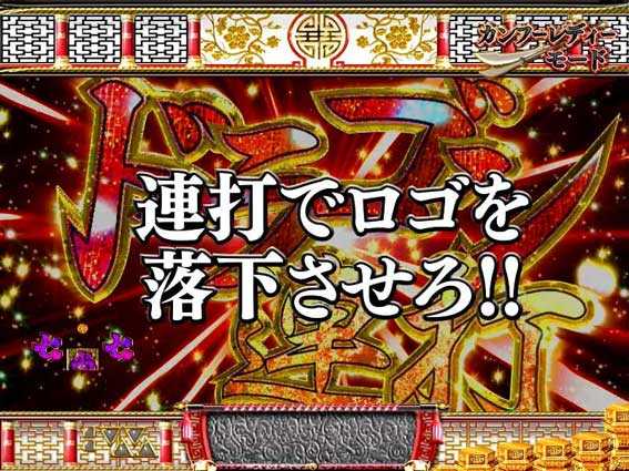 カンフーレディーモード限定の激アツリーチ。ボタン連打でロゴ役物が落下すれば大当り!