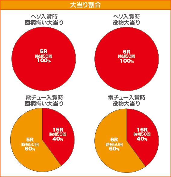 ヘソ大当り時の100%、電チュー大当り時の60%で選択される実質5R大当り。