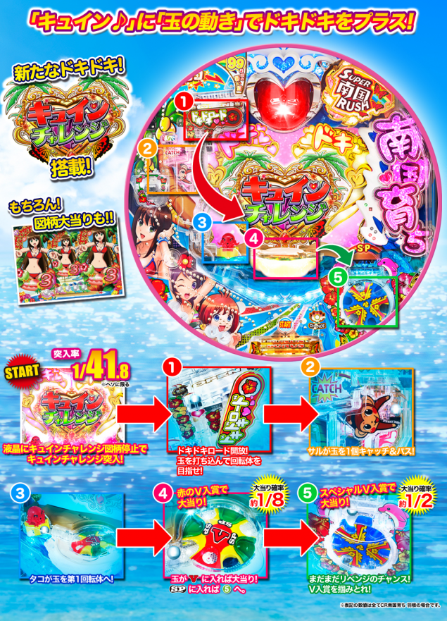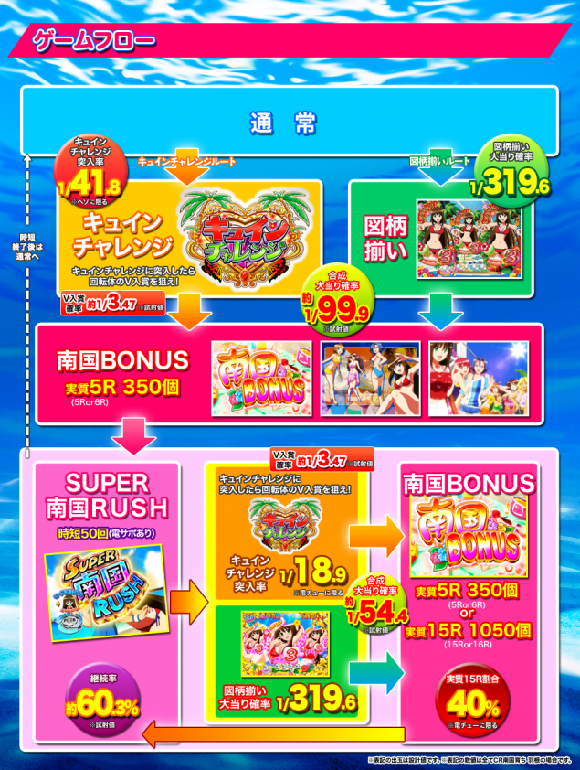 全ての大当り終了後に突入する、電サポ50回転の時短。SUPER南国RUSH中はキュインチャレンジ突入率が1/18.9にアップするため(電チュー入賞時)、連続大当り獲得の期待大となる。継続率は約60.3%だ!