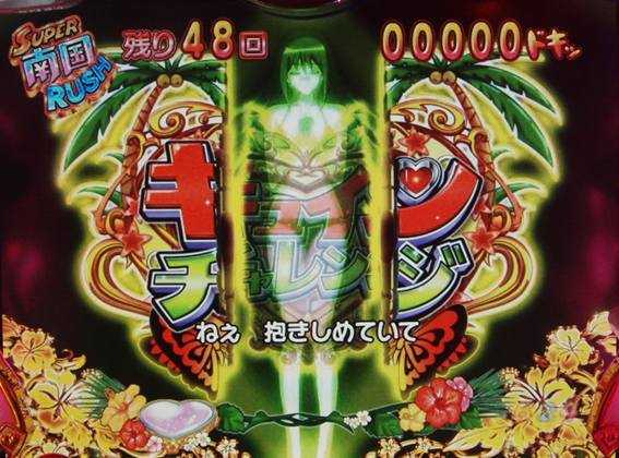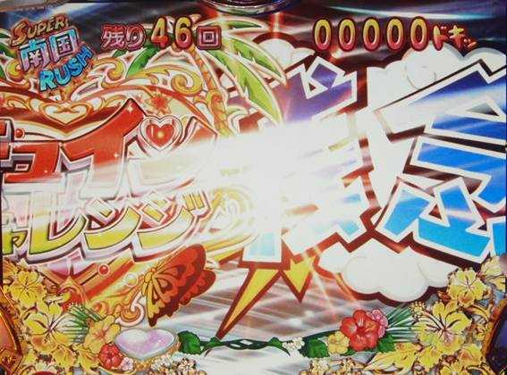 SUPER南国RUSH中は比較的シンプルながら多彩に用意された演出によってキュインチャレンジ突入の期待感が煽られる。最終的にロゴ獲得でキュインチャレンジ突入となるが、ロゴ獲得後に数字の3つ揃いに変化して直撃大当りに昇格するケースもある。