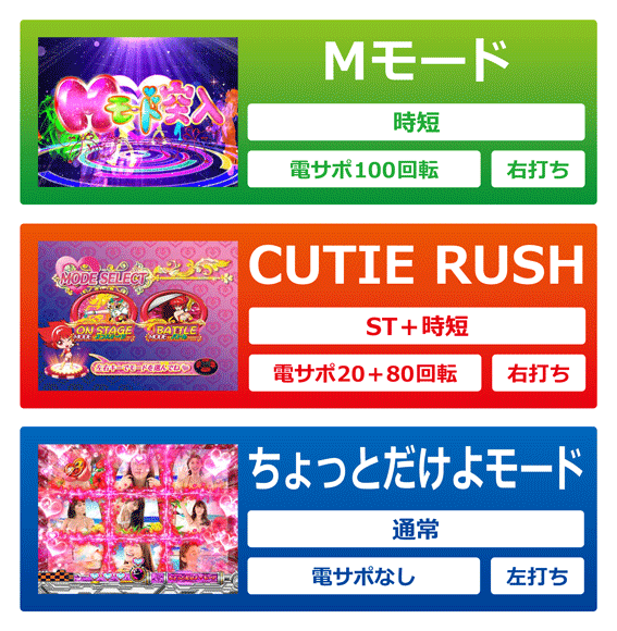 ヘソ入賞のすべての大当り後に移行。100回転の時短モードで、ココで大当りを引き戻せば晴れてCUTIE RUSHに突入する(引き戻し率は約45%)。回転数によって演出内容が変化するぞ。