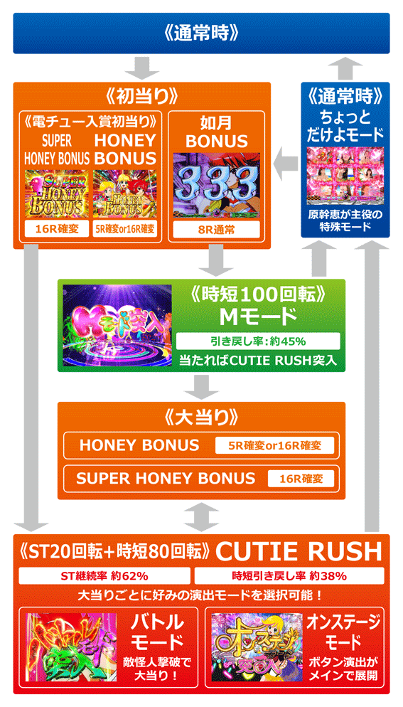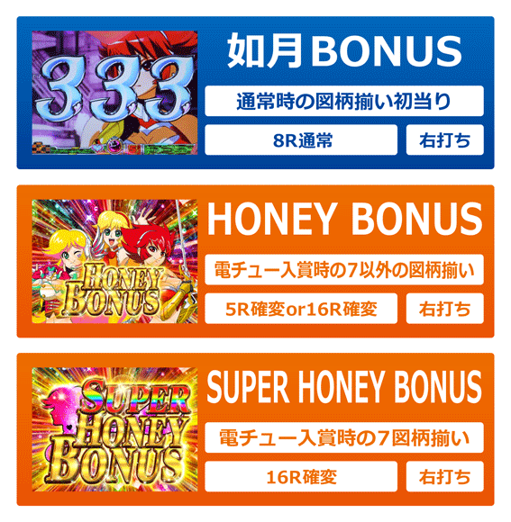 | 変動中演出 | ・通常連続演出(×3) ・変身連続演出(×3) ・変身ストック(5個溜まる) ・SDハニー群 |