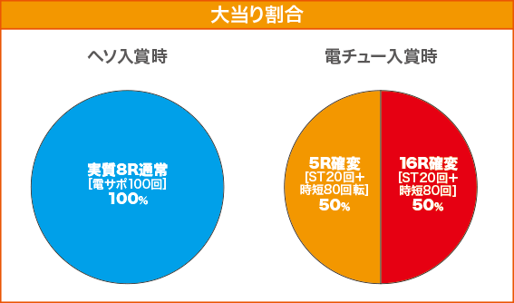 | 確変突入率 | ヘソ入賞時:0% 電チュー入賞時:100% (ST20回転) |