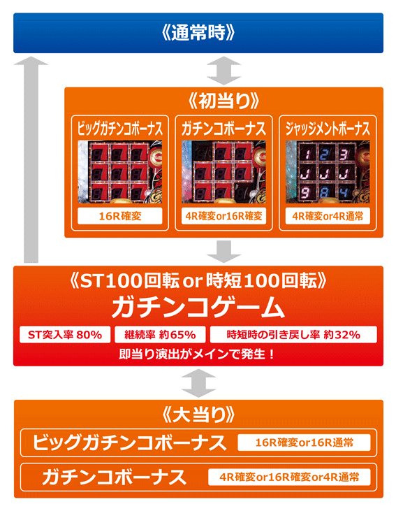 通常時にJ図柄が揃うと発生。ラウンド中のジャッジメントチャンスに成功すると4R確変となり、大当り終了後はST状態のガチンコゲームに突入。ジャッジメントチャンスに失敗すると、大当り終了後は通常時に戻る。