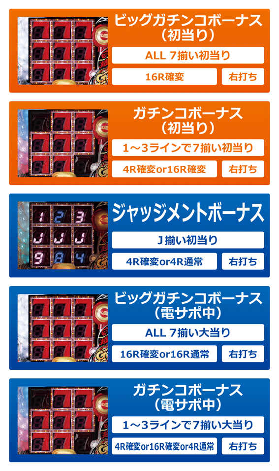 電サポ中に1~3ラインで7が揃うと4R確変or4R通常or16R確変。16Rへ昇格した場合は確変大当り濃厚だ。大当りが4Rで終了した場合、突入するガチンコゲームはSTor時短となる。