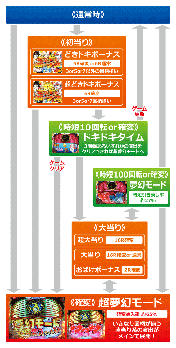 どきドキボーナス終了後に突入する、10回転の電サポモード。10回転以内に演出をクリアできれば確変となり超夢幻モードへ突入、演出に失敗すると内部的に時短だったことが確定して通常時に戻る。