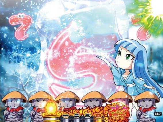雪ねえさんがハズレ図柄を凍らせて大当りを狙う。背景に地蔵がいればチャンスアップだ。