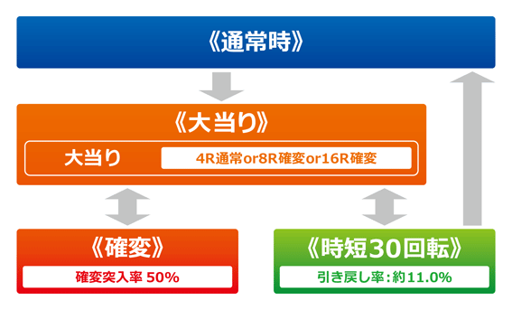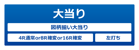 4Rで終了した場合は通常、8R以上継続した場合は確変となる。なお、ラウンド中にボタンPUSH演出が発生した場合、ボタン押下で「H」が7セグに表示されると上位ラウンドに昇格する。