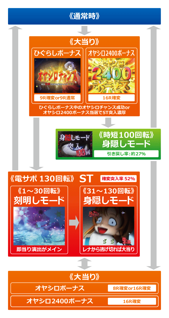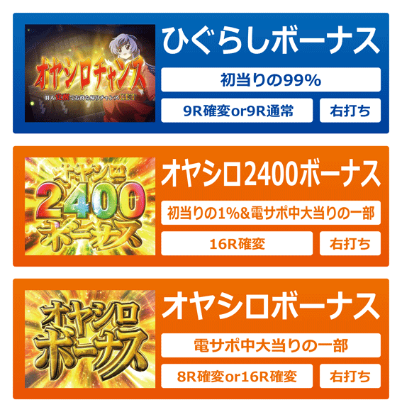 通常時のほとんどの大当りがひぐらしボーナスとなる。ラウンド中に発生するオヤシロチャンスで羽入が覚醒すれば9R確変&ST突入、覚醒失敗で9R通常&時短突入となる。
