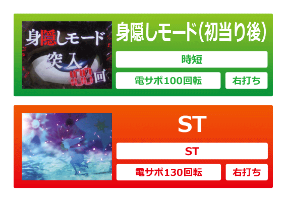 確変大当り終了後に突入する、130回転の電サポ付きST。1~30回転は即当りメインの刻明しモード、31~130回転はレナから逃げ切れば大当りとなる身隠しモードが展開する。