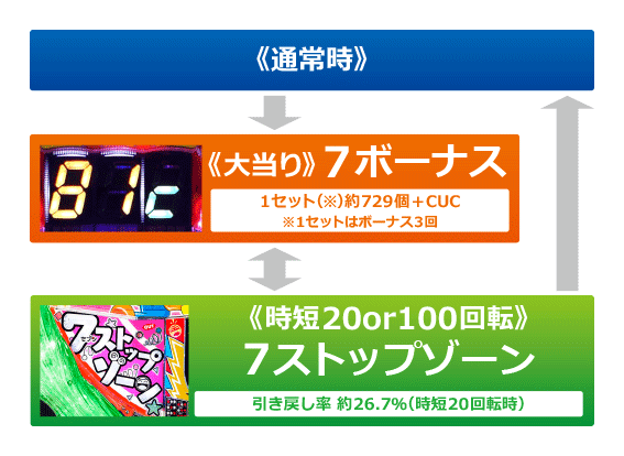 図柄が3つ揃う、または7図柄が2個停止で発生。1セット3回の大当り+カウントアップチャレンジをまとめて「7ボーナス」と呼ぶ。獲得出玉(払い出し)は約729個と、カウントアップチャレンジで上乗せされた分となる。7ボーナス終了後は20回転or100回転の時短に突入する。