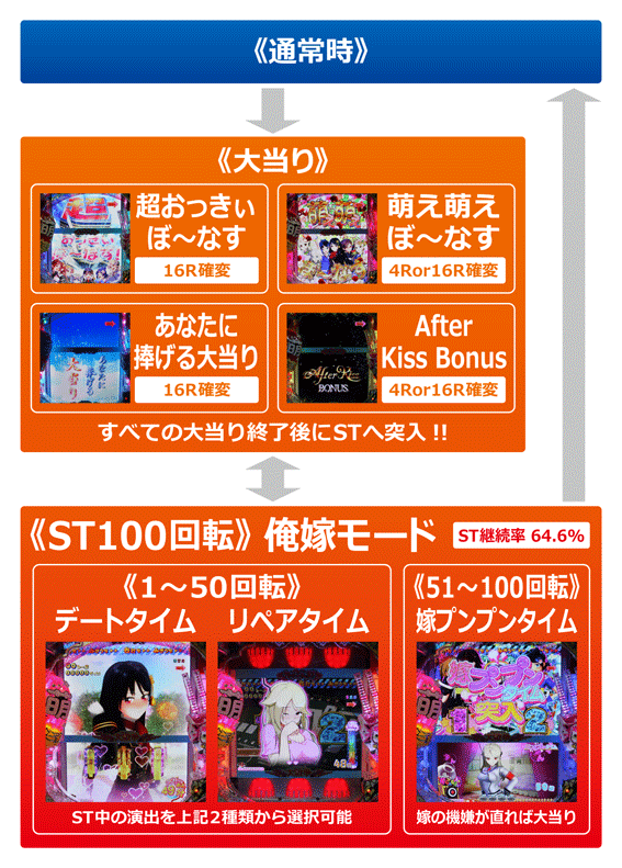 電サポ100回転のST。前半50回転は「デートタイム」or「リペアタイム」(ST開始前に選択可能)、後半50回転は「嫁プンプンタイム」が展開する。ST100回転での大当り発生率は64.6%となっている。