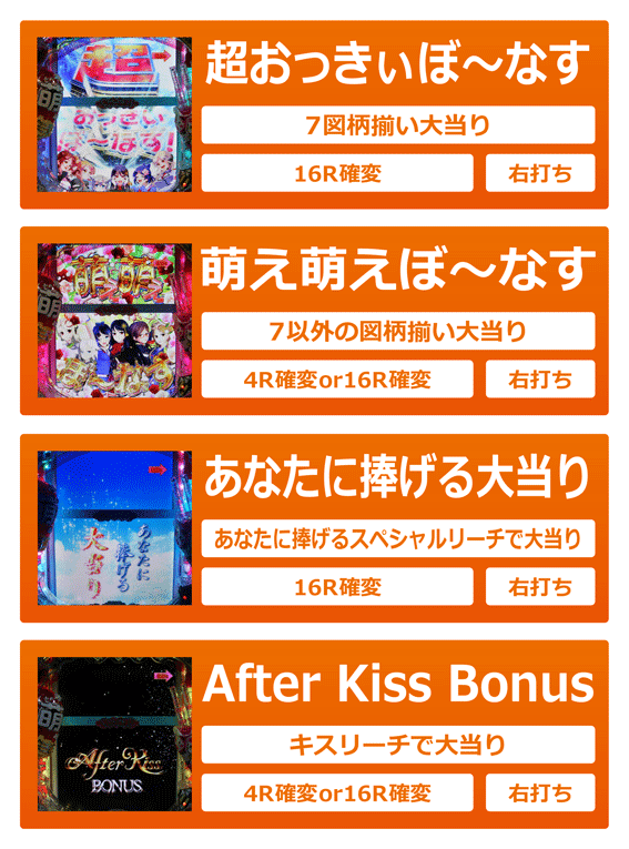 | 変動中予告 | ・テンションアップ予告 (レベル8以上) ・テンションブースト ・萌え萌えカットイン |