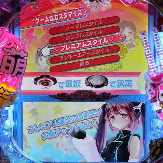 待機画面でPUSHボタンを押すと、ゲーム性のカスタマイズやキャラクター選択などができるようになる。例えば、上記画面のようにプレミアムスタイルを選択すると、大当り変動でプレミアム演出が出現しやすくなるぞ!