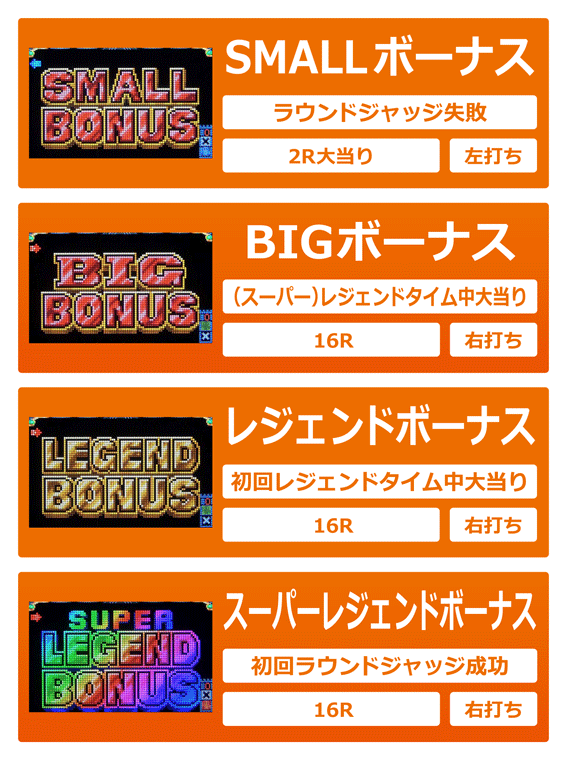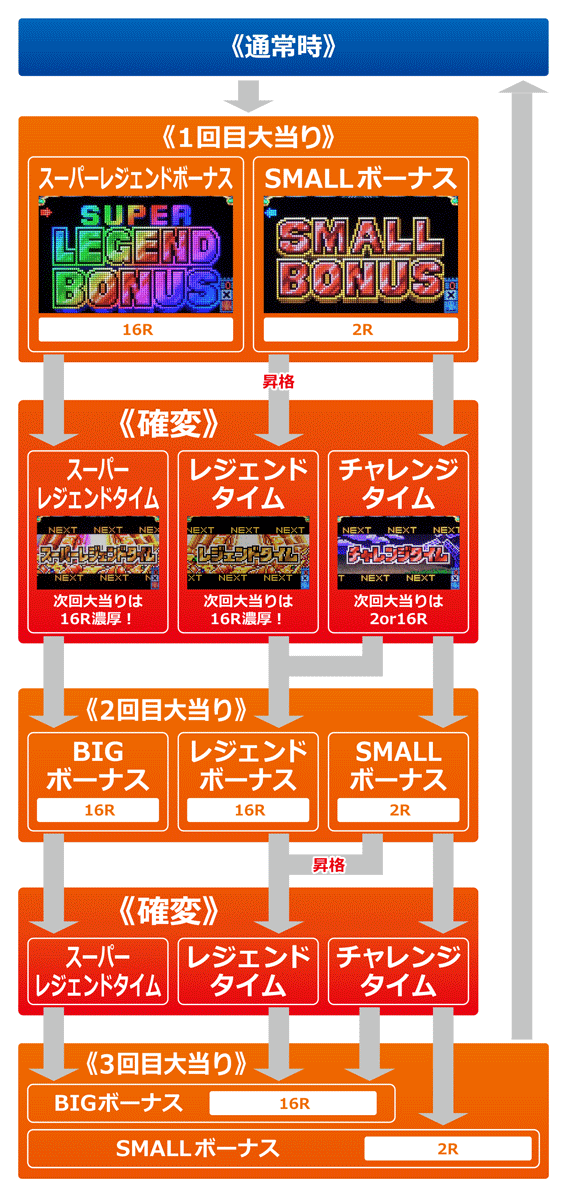 (スーパー)レジェンドタイム中に発生する16R大当り。2連目のBIGボーナス終了後はスーパーレジェンドタイムに突入し、3連目のBIGボーナス終了後は通常時に戻る。