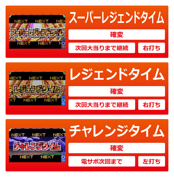 ★確変モードは3種類。(スーパー)レジェンドタイム中は右打ち、チャレンジタイム中は左打ちで消化。
