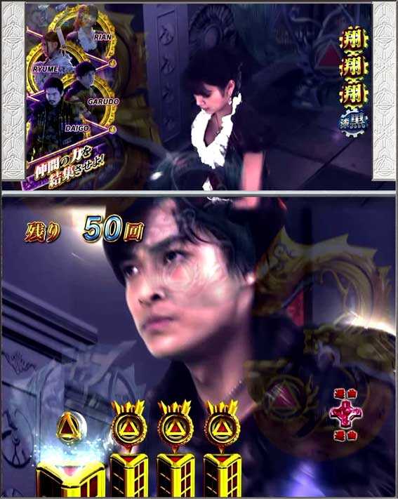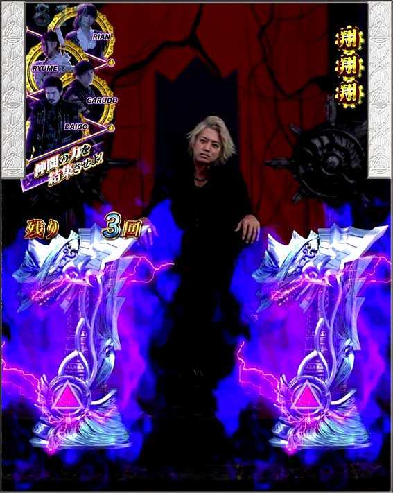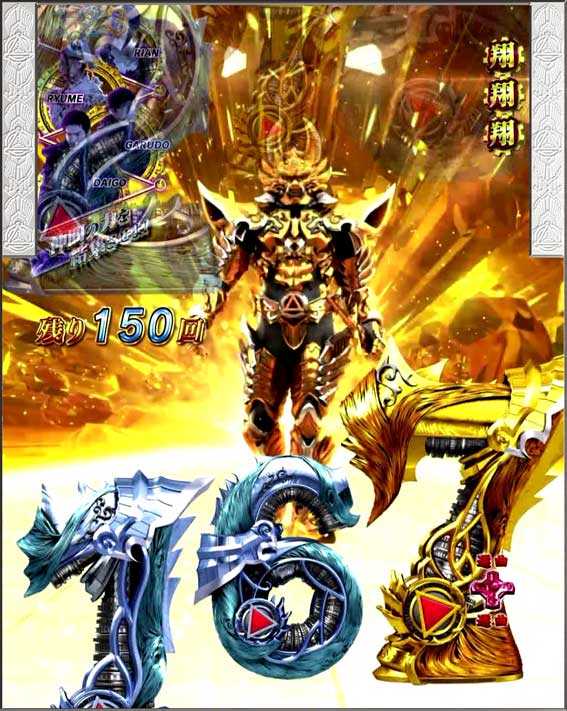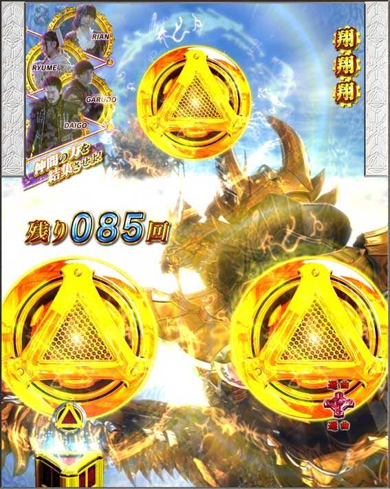 銀図柄揃いで発生。基本的には16Rの通常大当りだが、ラウンド中に心音(早さに秘密あり!?)が発生してP.F.O.G.翔完成となる確変昇格演出が発生することもあるぞ。また、心音演出に失敗してもザルバが登場して逆転昇格パターンも存在する。