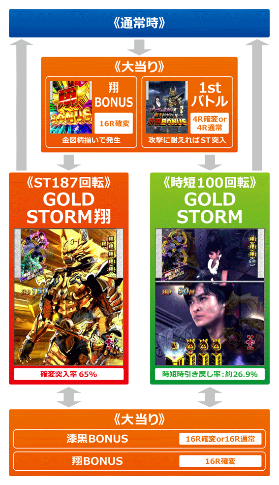 状態を問わず金図柄が揃うと発生する16R確変大当り。終了後はSTに突入する。