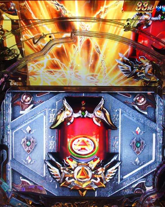 図柄揃い直後は、ボタンPUSHで金図柄揃いへの昇格を狙う演出が発生する。
