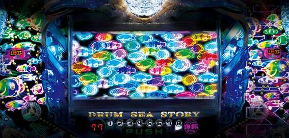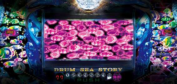 『海物語』がドラムパチンコになって登場。スペックは甘デジ海シリーズと同様のSTタイプだ。演出においては、「魚群出現=激アツ」という超基本ポイントは変わらず、ドラムながらも非常に多彩な予告&リーチバリエーションが用意されている。