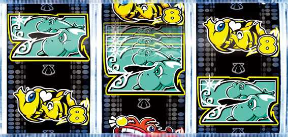 中リール中央にチビザメ図柄停止でスーパー発展&期待大! チビザメ停止時に図柄が赤点滅するとさらにアツい!!