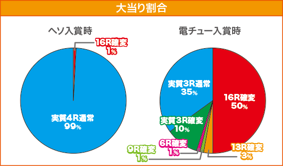 電サポ中の一部で発生する大当りで、3Ror6Ror9Ror13Ror16Rのランクアップ方式で展開。大当りの振り分け的に3Rを超えたら確変が確定するので、超えることを祈ろう。