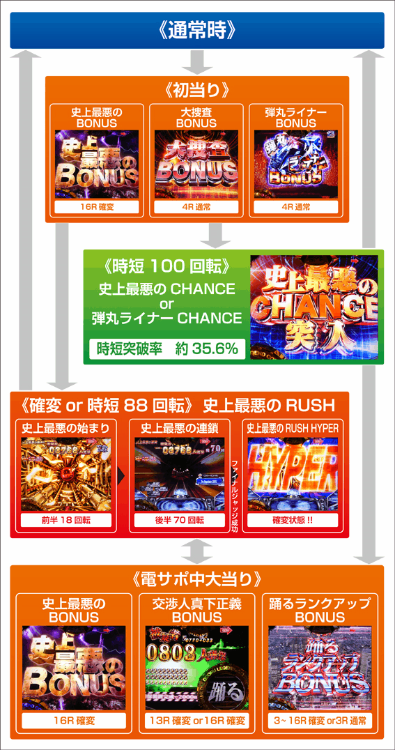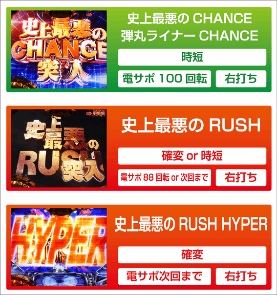 電チュー大当り後に必ず突入する確変or時短88回転のモード。モード中は前半18回転の「史上最悪の始まり」と、後半70回転の「史上最悪の連鎖」で構成されており、滞在している区間によって演出系統が変化する。
