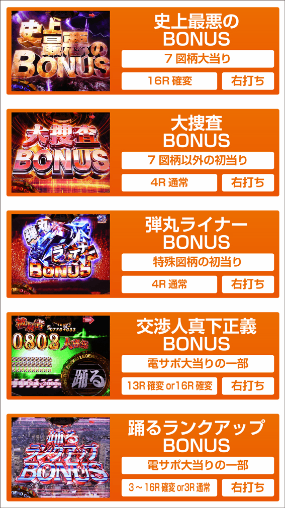 凶悪事件系SPリーチは「バスジャック犯」「銀行強盗犯」「爆発物所持犯」の3種類。いずれのリーチもリーチアップして仲間が増えるほど信頼度もアップする。タイトル・セリフ・カットインが赤ならチャンス、金なら大チャンスだ!