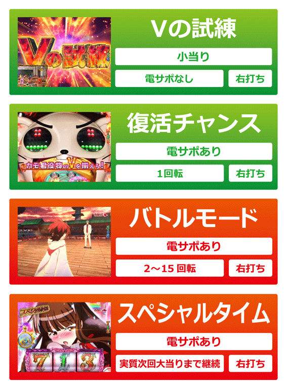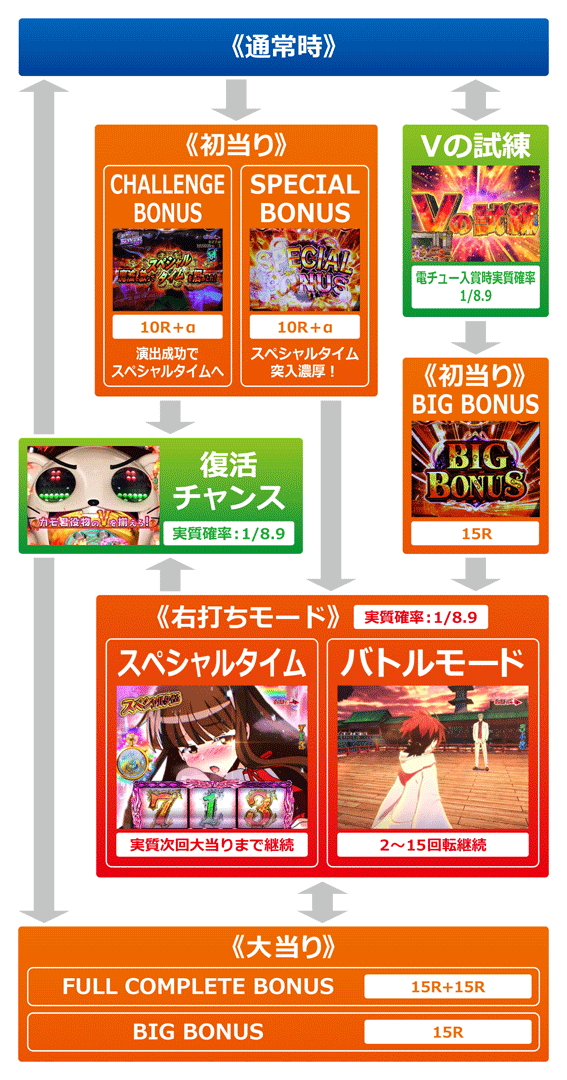 主に初当り後(Vの試練はCHALLENGE BONUS失敗時除く)に突入する実質確率1/8.9の右打ちモード。継続回数は99回転だがそこまでハマることはほぼなく、実質次回大当り当選が濃厚。液晶では即当り演出がメインで展開する。