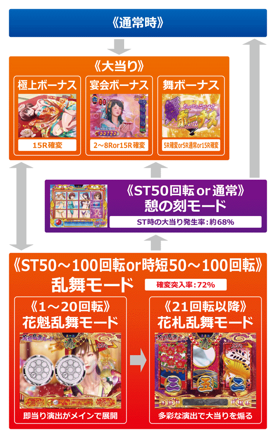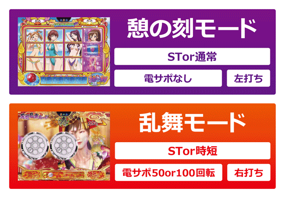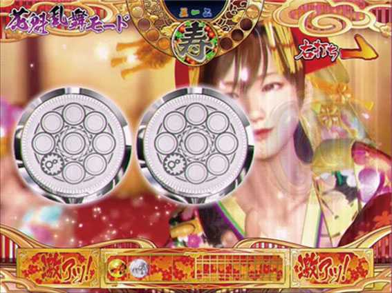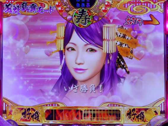 STor時短の電サポモードで、上記のように突入契機によって状態と継続回数が変わる。液晶では、20回転目までは花魁乱舞モード、21回転以降は花札乱舞モードが展開する。本機のSTは100回転だが、初回大当りが極上ボーナス以外だと、内部的にSTでも50回転で電サポが終わってしまうのでヤメ時には注意したい。