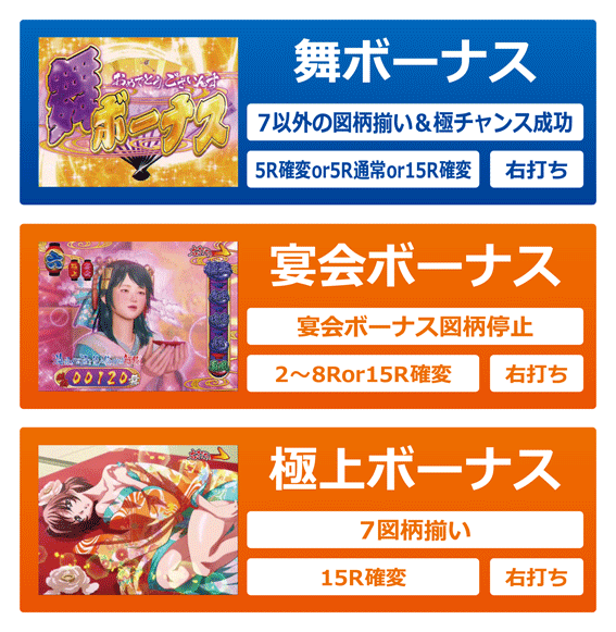 7以外の図柄揃い、または極チャンス経由で当たると発生。基本的には5Rの確変or通常大当りだが、極上ボーナスに昇格する可能性もある。大当り終了後はSTor時短の乱舞モードに突入する。