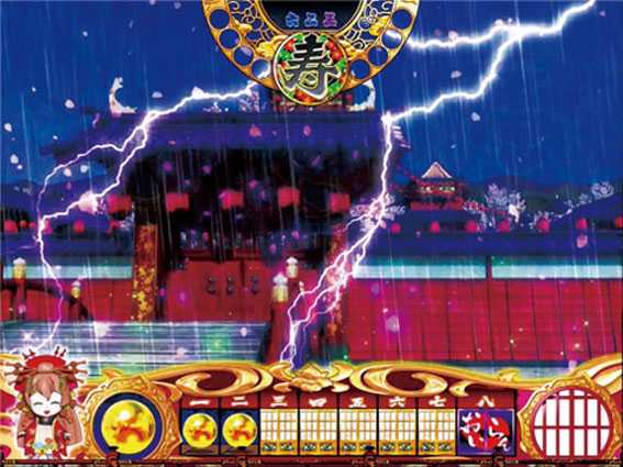 | 楓 | ■花が大量に舞う・・・17.9% ■もみじの色が赤・・・19.9% ■赤カットイン(ドット「チャンス」)・・・23.6% ■赤カットイン(ドット「激アツ」)・・・88.0% ■赤カットイン(ドット「V」)・・・大当り濃厚 ■プッシュボタン(赤orデカ赤)・・・大当り濃厚 |
