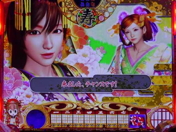 最終的にふすまを開けた先に花魁がいれば大当りとなる高信頼度リーチ。花魁それぞれがアップになった際、背景に赤エフェクトのアイテムが出現すればチャンスアップとなる。