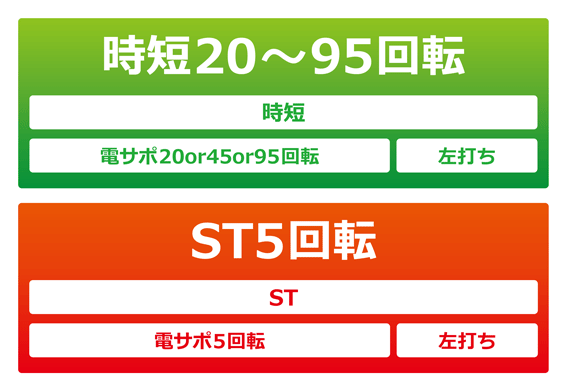 ST中に大当りを引けなかった場合に突入。ST突入前の大当りが5Rだと20or95回転、7Rだと45or95回転、15Rだと95回転継続。