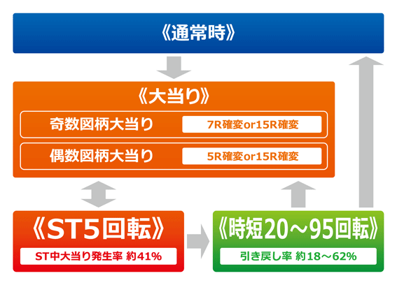 | 電サポ | 25 or 50 or 100回転 (ST5回転+時短20 or 45 or 95回転) |