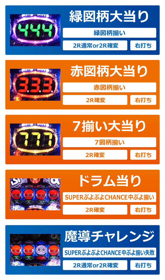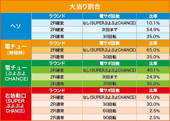 基本的には2Rの確変大当りで、終了後はぷよぷよCHANCE(赤)に突入。ラウンド中にぷよ連エンブレムがレインボーに光ってSUPERぷよぷよCHANCE突入となる可能性もあり。
