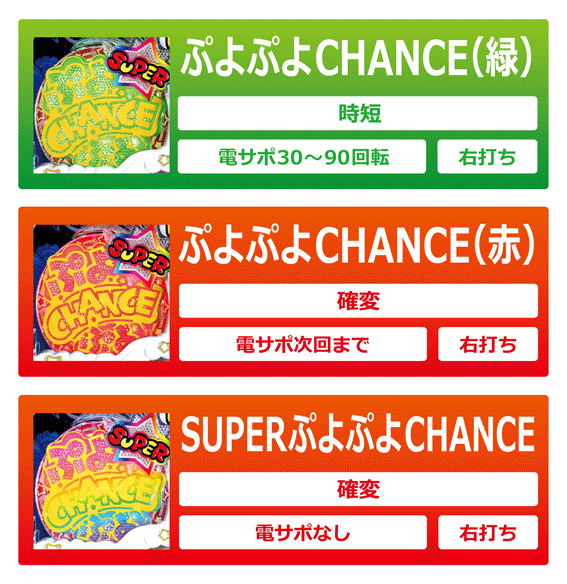 電サポありの確変モードで、専用の予告&リーチ演出が展開。ただし、小当りラッシュは発動しないので、基本的に消化中に出玉が増えることはない。なお、ぷよぷよCHANCE(赤)中は全大当りの約40%がSUPERぷよぷよCHANCE突入となる。