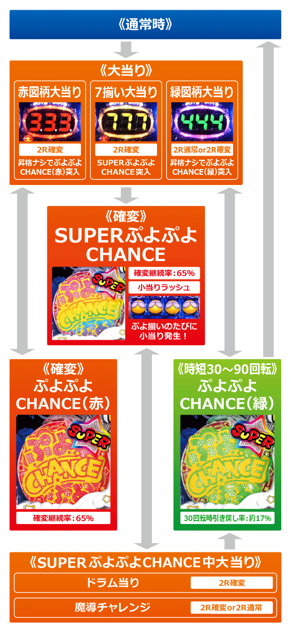 3or7以外の図柄揃い大当り中に昇格しなかった場合に突入。30~90(※)回転の時短で、内部的に確変の可能性はないが、確変大当りを引けばSUPERぷよぷよCHANCE突入濃厚だ。