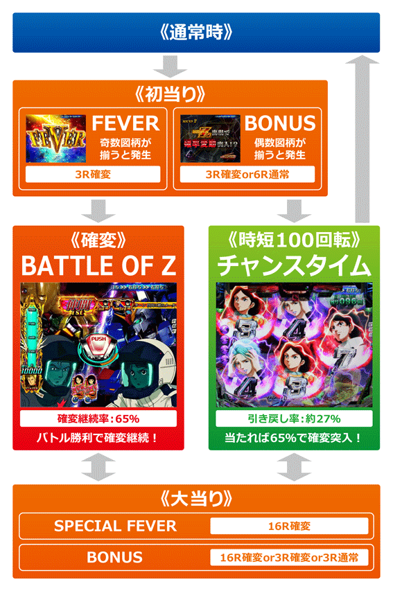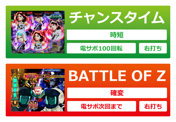 確変大当り終了後に突入。大当りの多くはバトル演出経由で発生し、Zガンダムが勝てば16R確変&BATTLE OF Z継続。負けると3R通常の可能性大となり、ラウンド中に昇格演出が発生しなければチャンスタイムへ移行する。