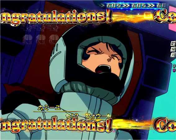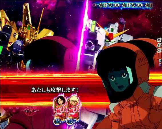 ノーマルリーチやSPリーチハズレ後のハマーン登場煽り成功で発展。クワトロがミネバと再会できれば大当りだ。