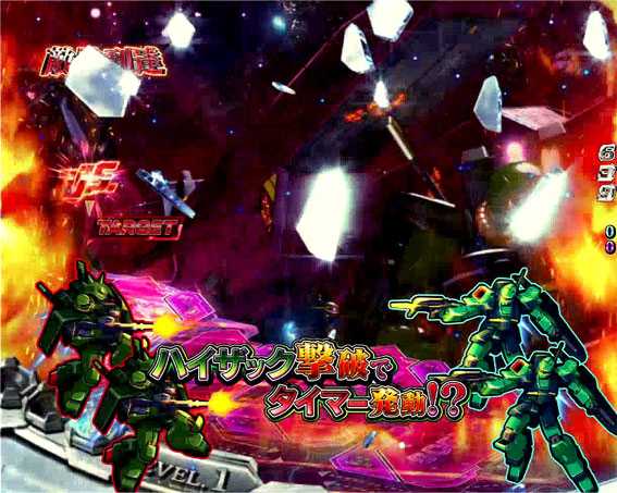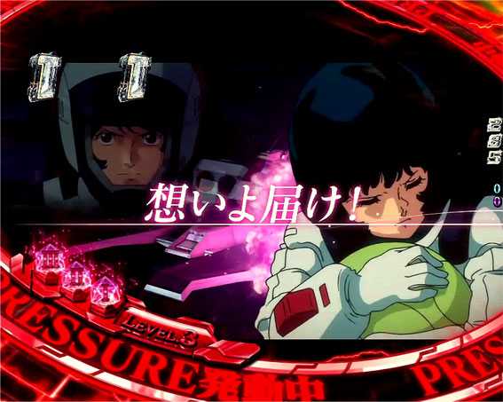 プレッシャー予告のレベル3or4は大当りに絡みやすいので要注目。その後MS/MA系リーチでカミーユが参戦し、クワトロ参戦やZガンダムハイパー化が絡むのが大当りの基本パターンだ!