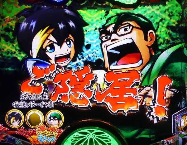 リーチハズレ後に発展の可能性アリ。助さん&格さんの呼びかけから、黄門ちゃまが登場して3人揃えば大当り!