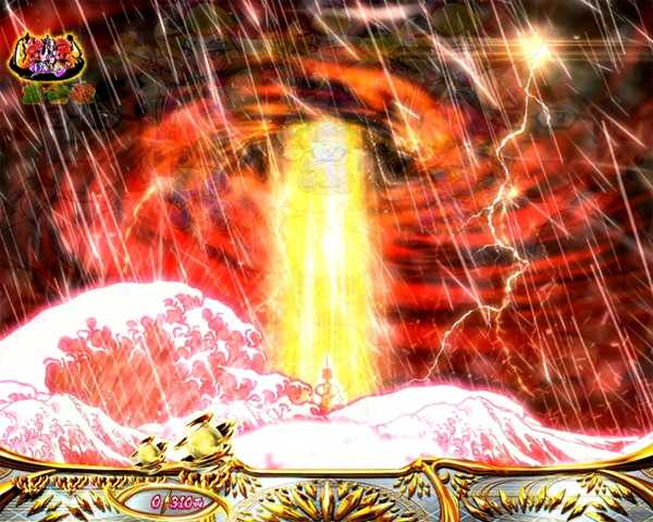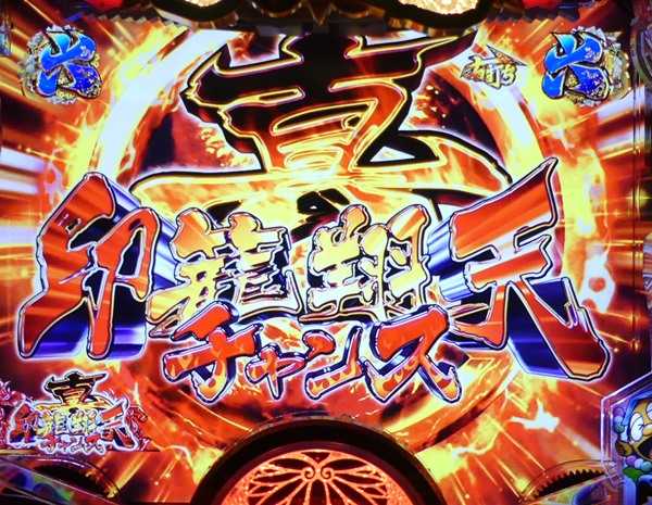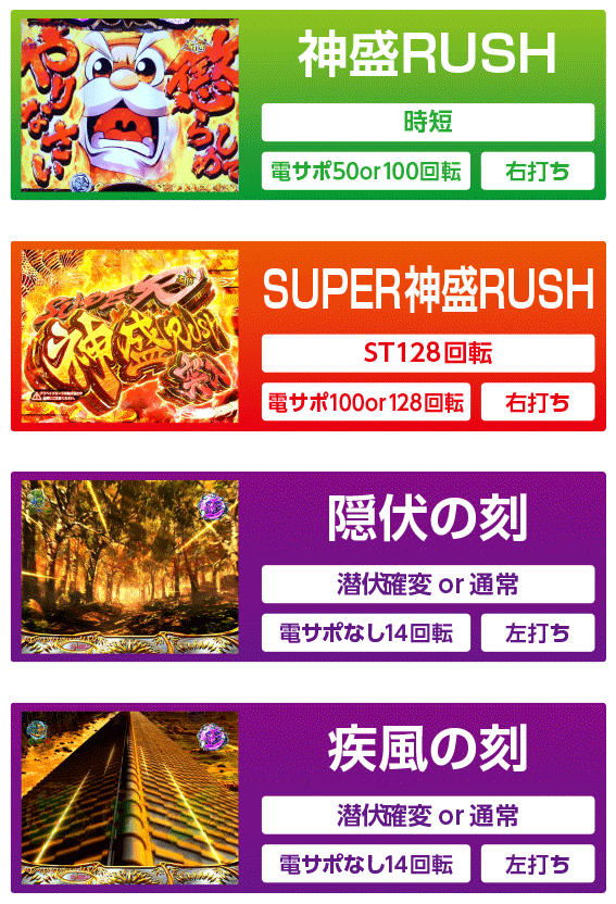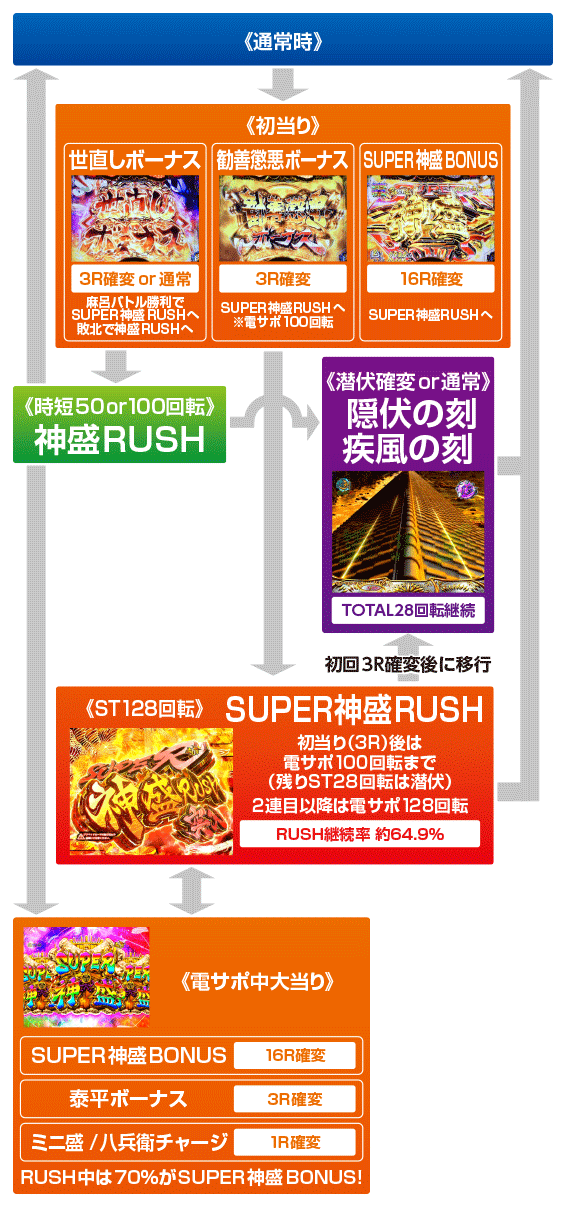 三・七図柄の初当りから移行する3R確変大当り。終了後はSUPER神盛RUSHに突入するが、電サポは100回転で終了する(101〜128回転目は潜伏確変状態)。